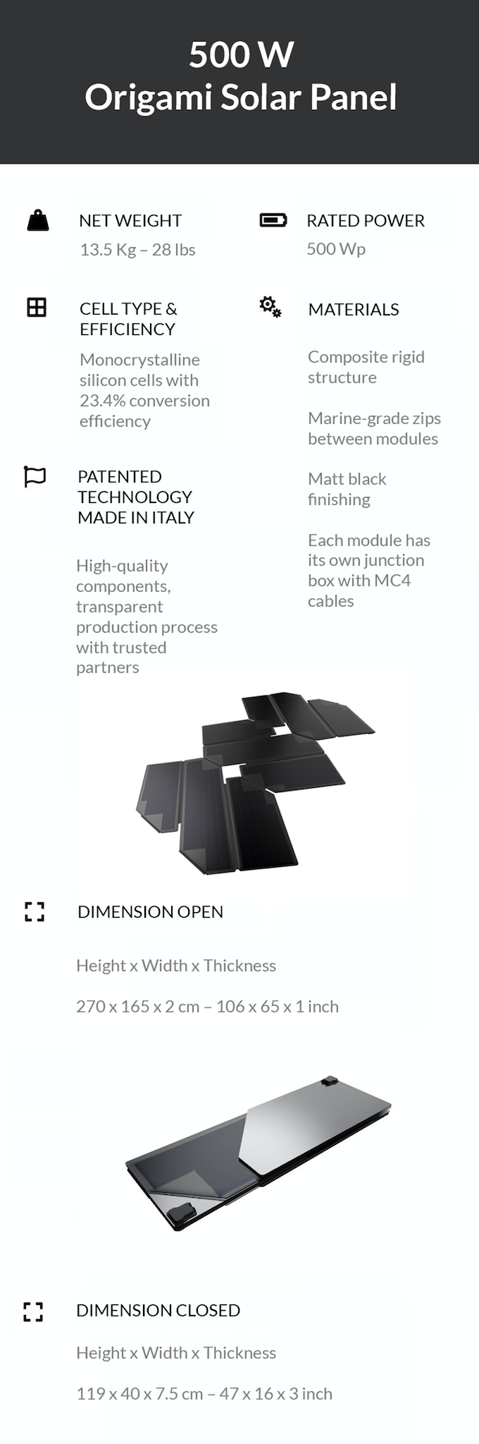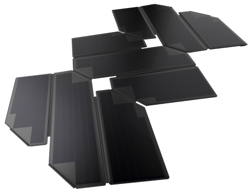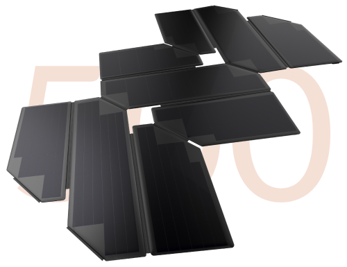 The 500 W Origami Solar Panel is effectively three sections of solar panels. The sections can be connected in series or in parallel, giving you different outputs depending on your needs.