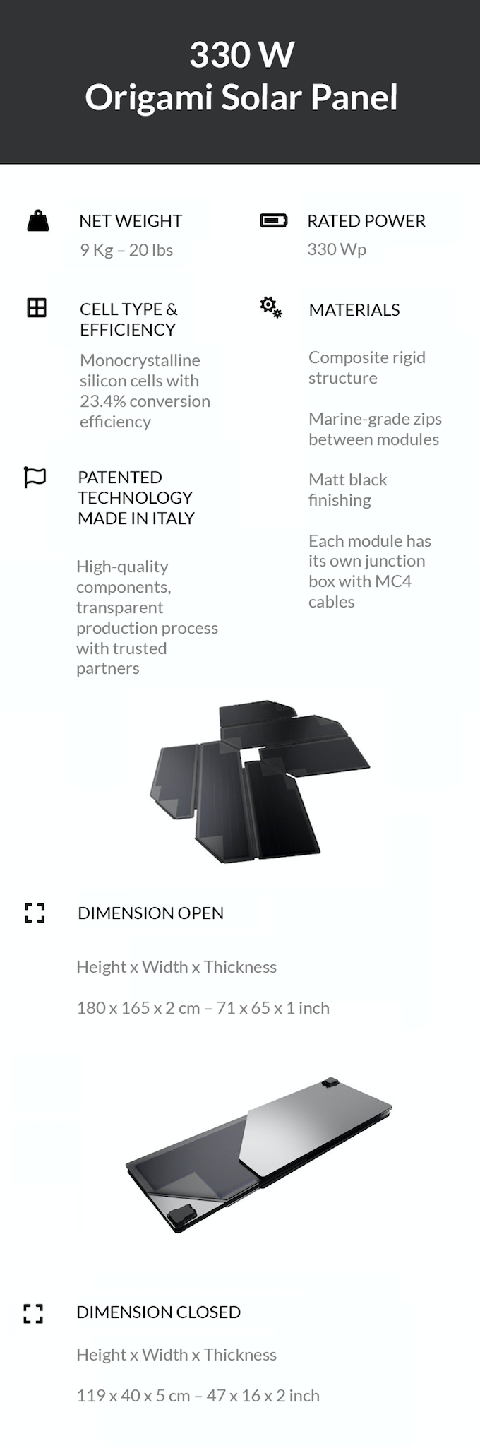 The 330 W Origami Solar Panel is effectively two sections of solar panels. The sections can be connected in series or in parallel, giving you different outputs depending on your needs.